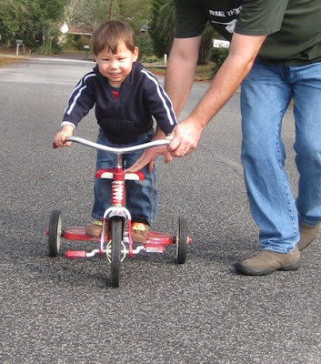 Until next time, enjoy these photos of his first ever ride on his tricycle. Notice the "Mater" shoes from the movie Cars? Another great gift from my parents.